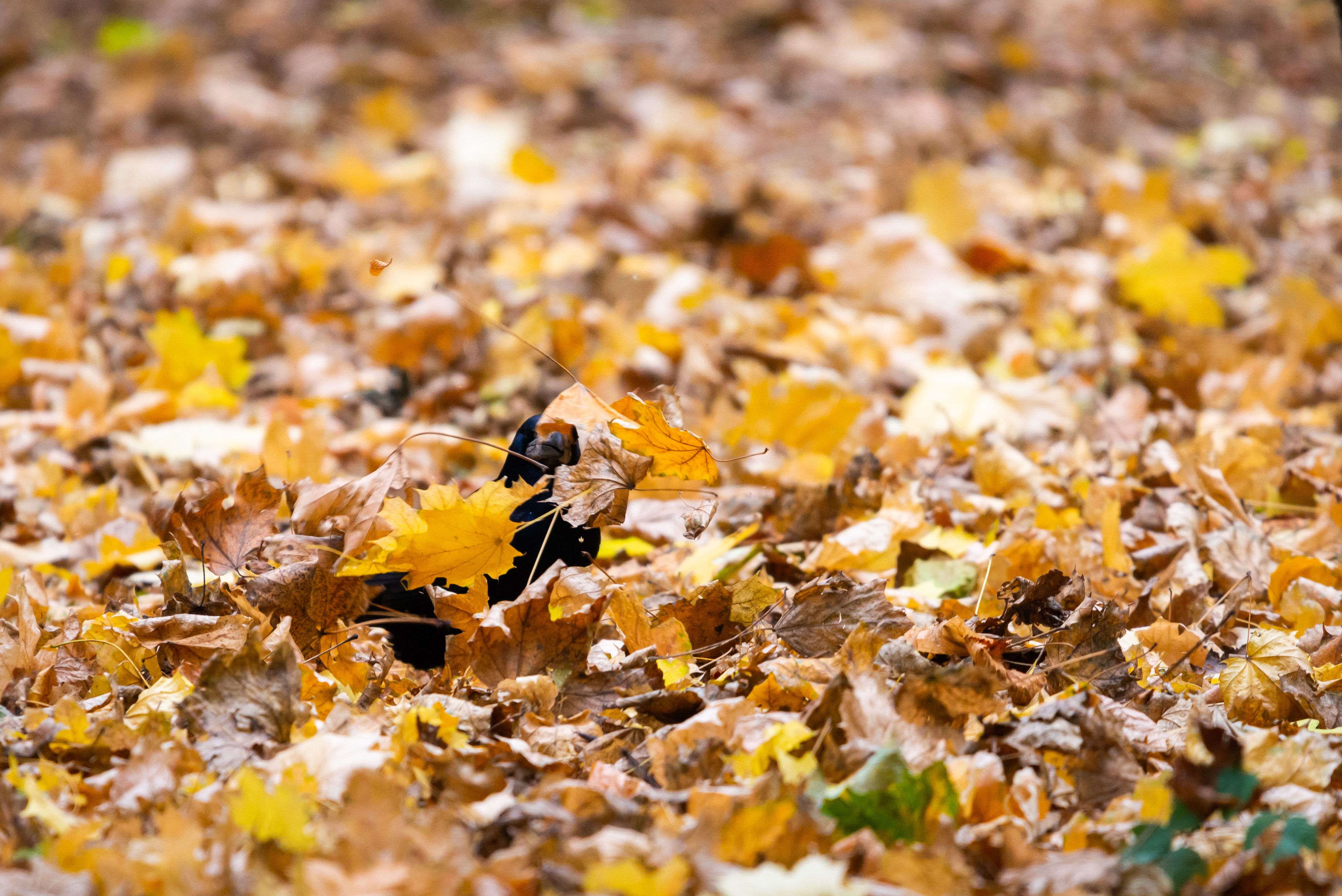 Среди этого буйства красок и форм, в глубине кадра, едва уловимо проглядывает темный силуэт птицы. Ее присутствие добавляет загадочности и интриги, намекая на жизнь, скрывающуюся под покровом природы. Это может быть птица, ищущая пищу или просто отдыхающая на земле, укрытая от посторонних глаз. Силуэт контрастирует с ярким фоном листьев, но при этом органично вписывается в общую атмосферу умиротворения и природной гармонии. Изображение идеально подходит для передачи настроения осени, ее тихого очарования и перехода к зимнему покою.