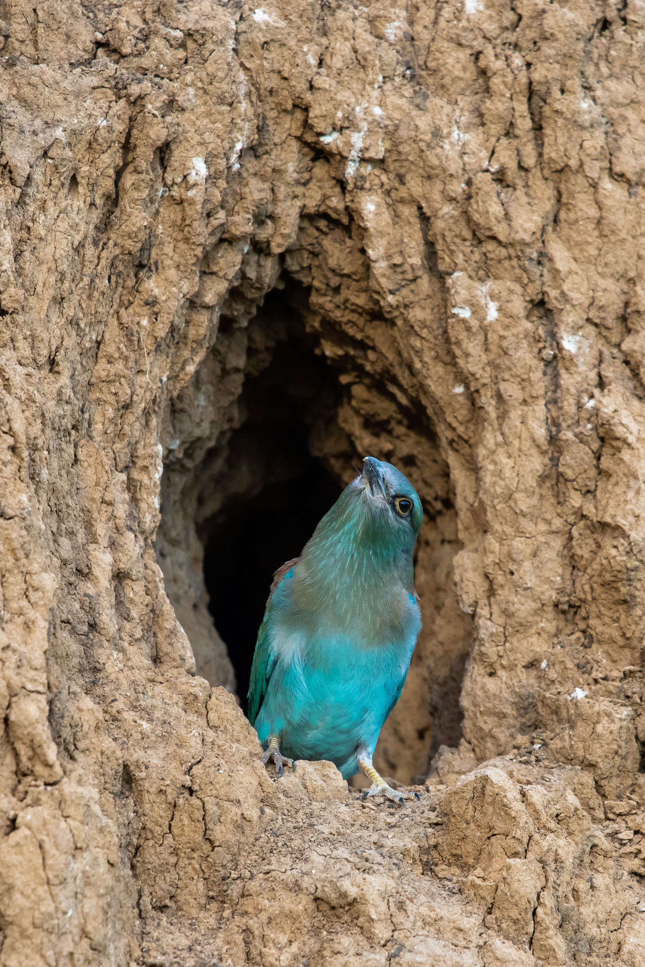The bird, likely a member of the roller family, appears alert yet calm, its gaze directed upwards as if observing something important or simply enjoying a moment of peace. The shallow but clearly defined burrow serves as its home, sheltering it from the outside world and providing a safe place for nesting and rest. The detail of the sandy wall is impressive, with visible fine cracks, irregularities, and signs of erosion, lending the image realism and depth.