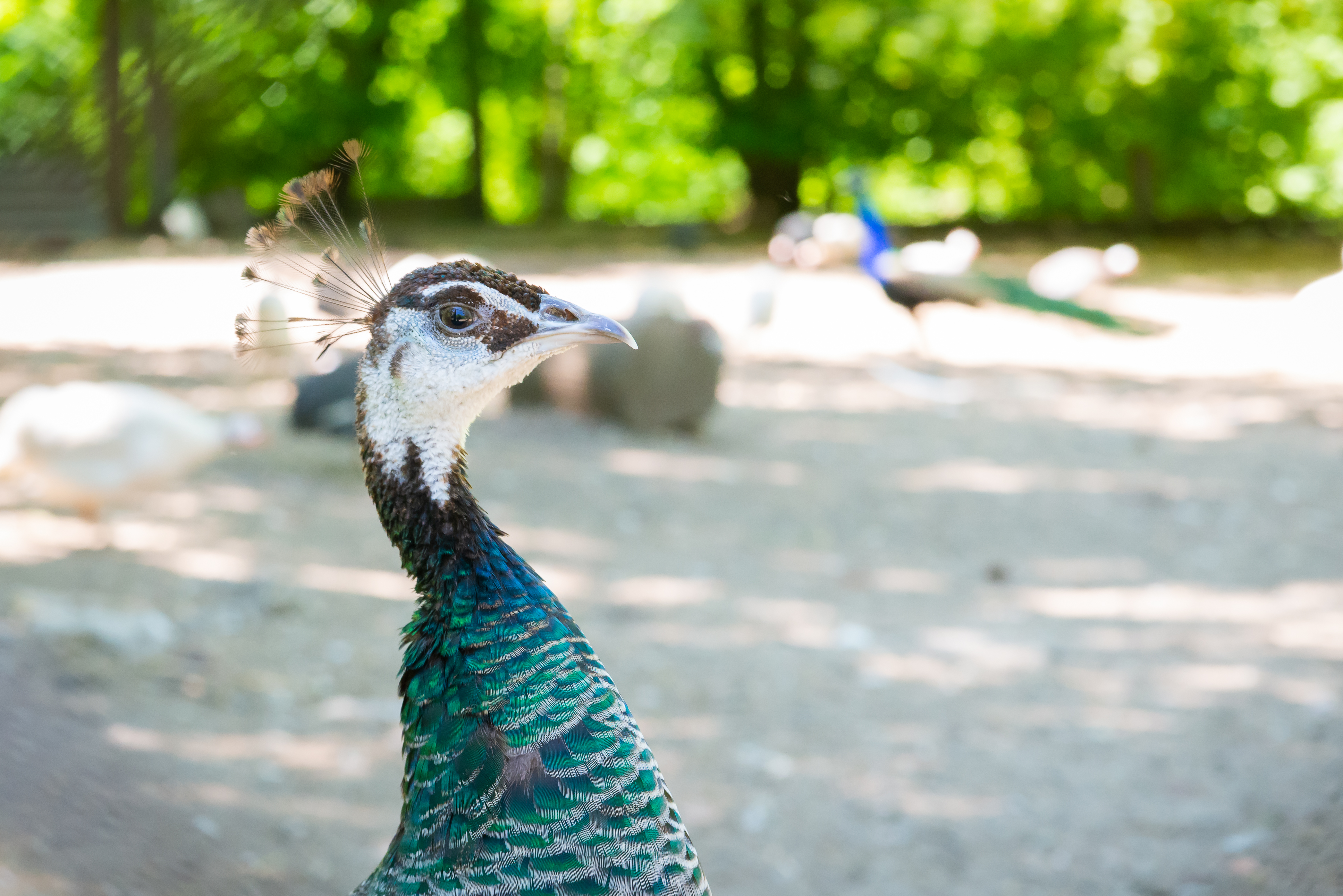 Изображение представляет собой крупный план головы и шеи молодого павлина, демонстрирующий его изысканное оперение. Птица находится в парке или саду, где на заднем плане видны размытые силуэты других павлинов, включая одного с ярко-синим и зеленым хвостом. Зеленая листва деревьев создает мягкий, боке-эффект, подчеркивая красоту главного объекта.