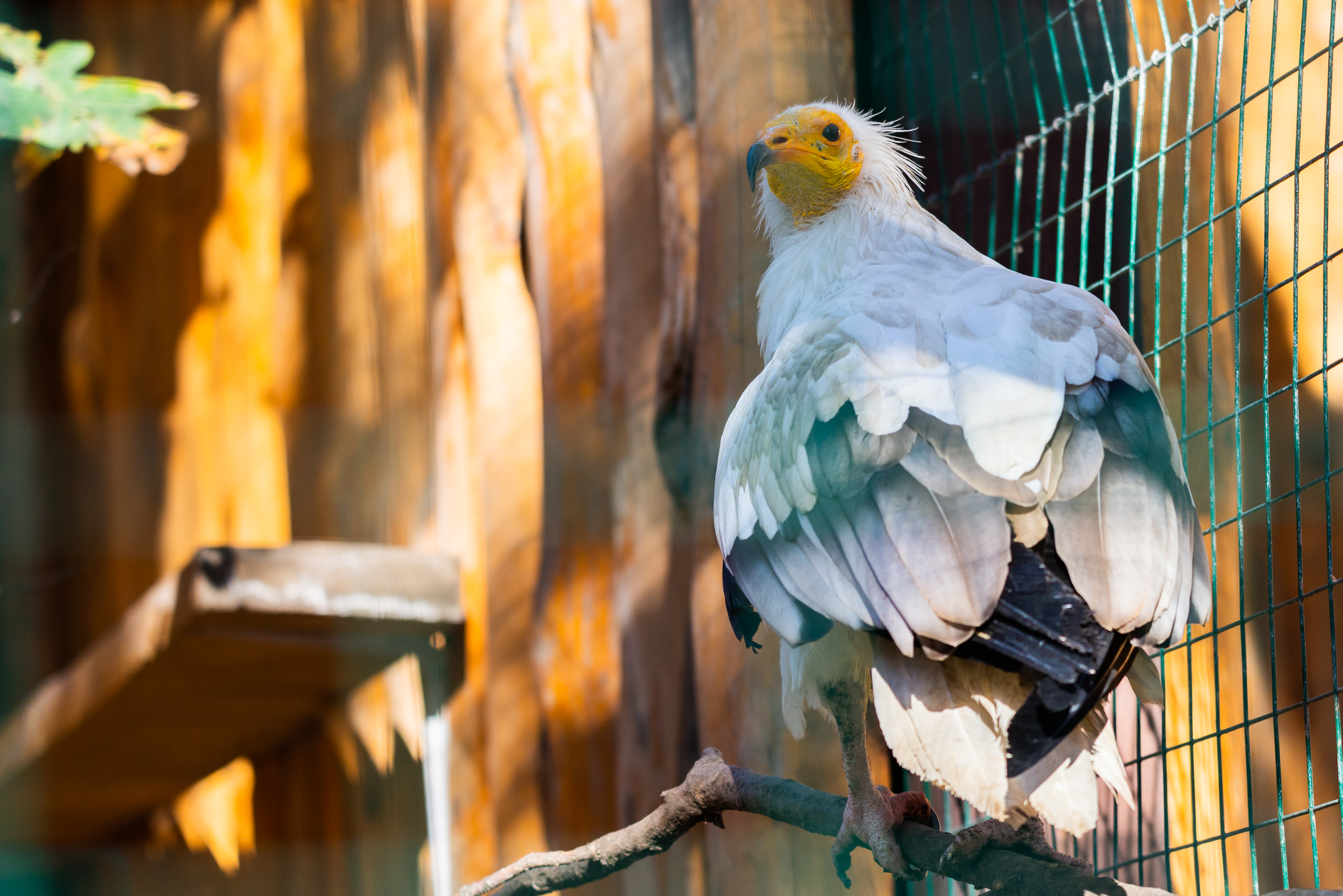 Египетский стервятник с желтой головой сидит на ветке в вольере