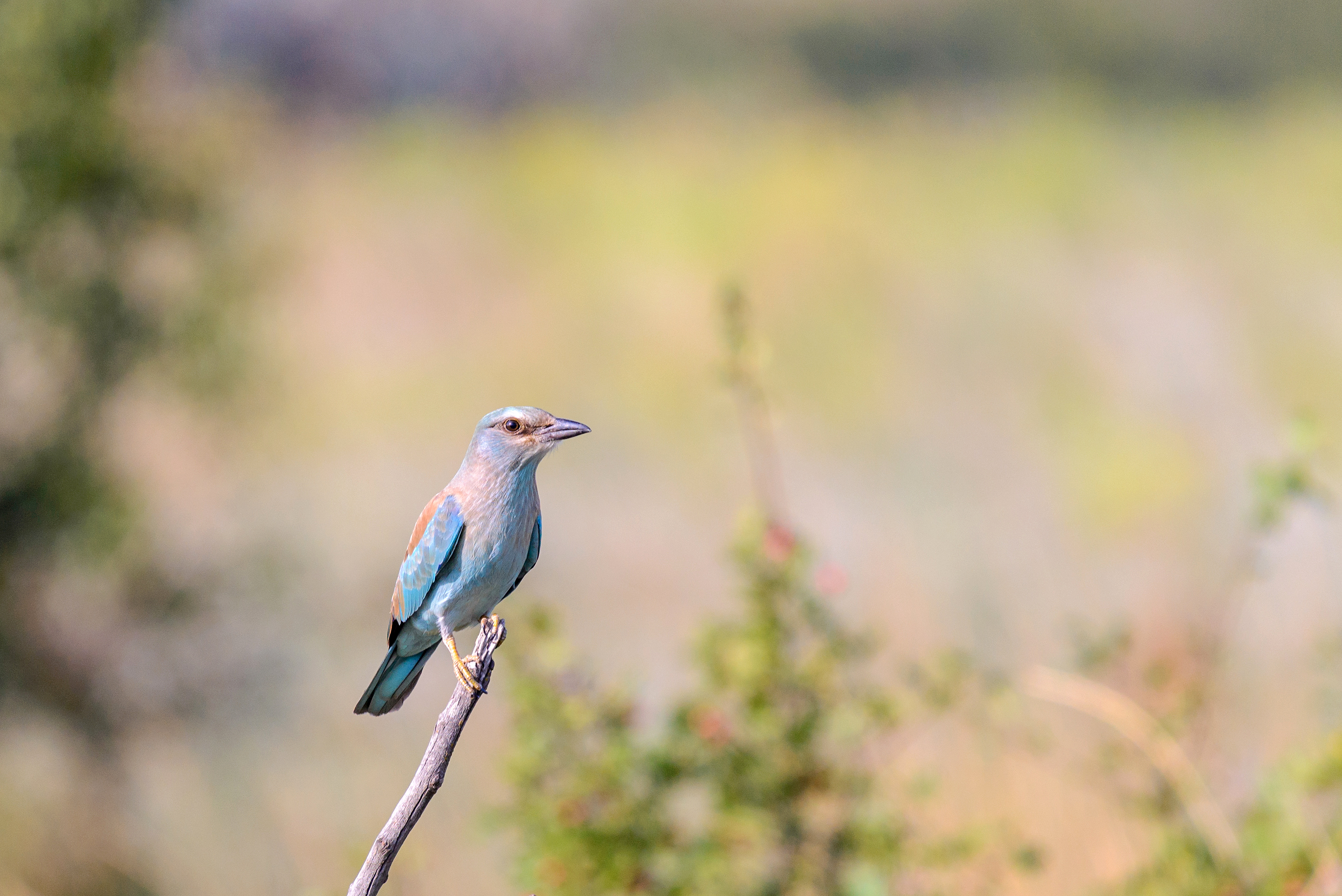 Этот снимок запечатлел изящную сизоворонку (Coracias garrulus), гордо восседающую на тонкой, сухой ветке. Птица обращена в профиль, демонстрируя свою яркую окраску: нежно-голубое оперение на груди и крыльях контрастирует с более темными оттенками на спине и голове, а клюв имеет характерную для этого вида форму.