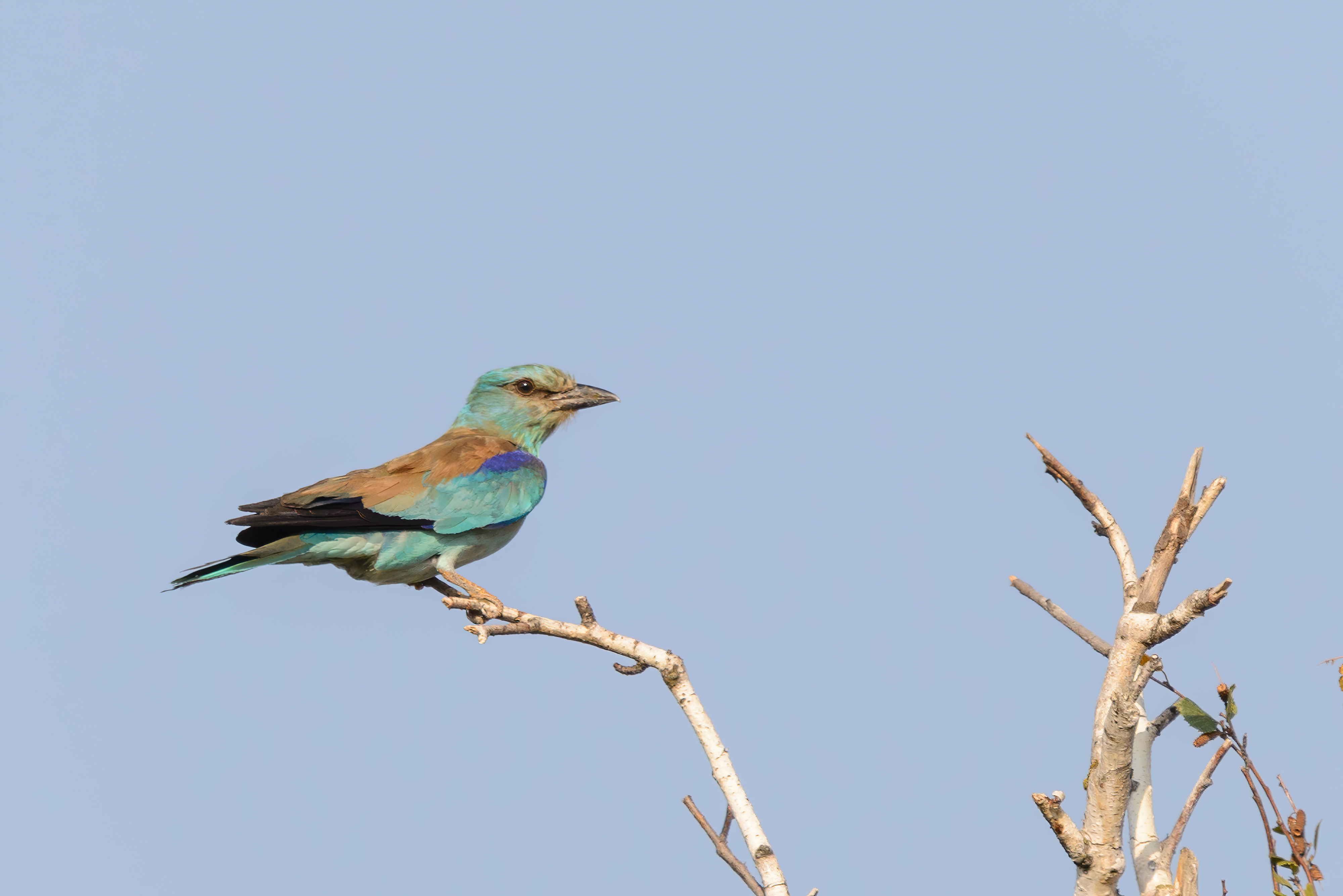 The image captures a magnificent European roller (Coracias garrulus) perched on a bare, dry branch against a clear, pale blue sky. The bird is positioned on the left side of the frame, its body turned to the right, and its head slightly tilted as if observing something out of view.