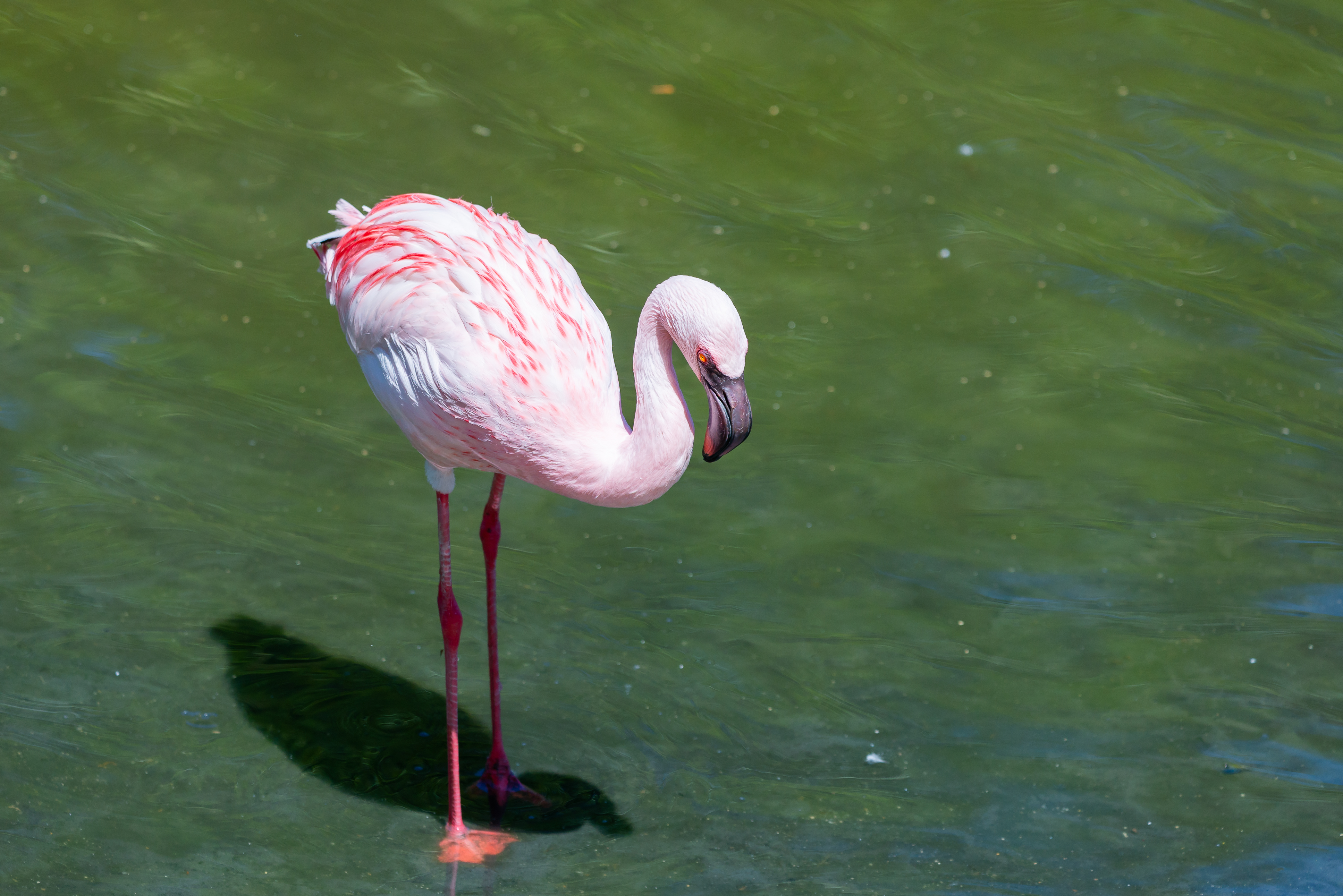 Птица стоит на своих тонких, ярко-розовых ногах, которые едва погружены в воду. Её тень, контрастно темная, отчетливо видна на дне водоема, создавая завораживающий визуальный эффект. Вода вокруг фламинго имеет насыщенный зеленый цвет, с легкой рябью, отражающей блики солнца и создающей ощущение движения и жизни.