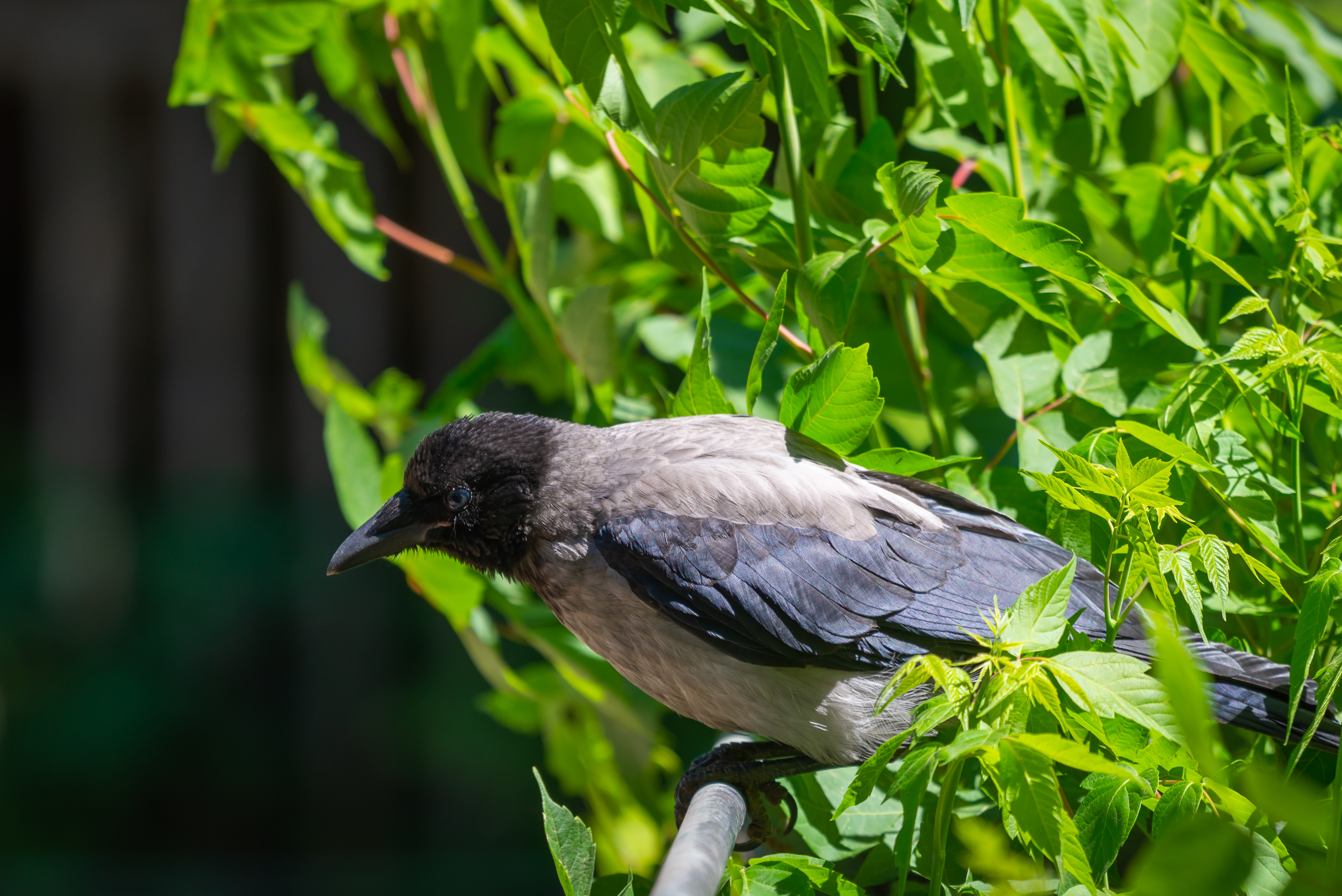 The crow appears alert, its gaze directed to the side, perhaps searching for food or observing its surroundings. Its gray plumage contrasts with its dark head and wings, as well as the bright green leaves, creating a visually interesting composition.