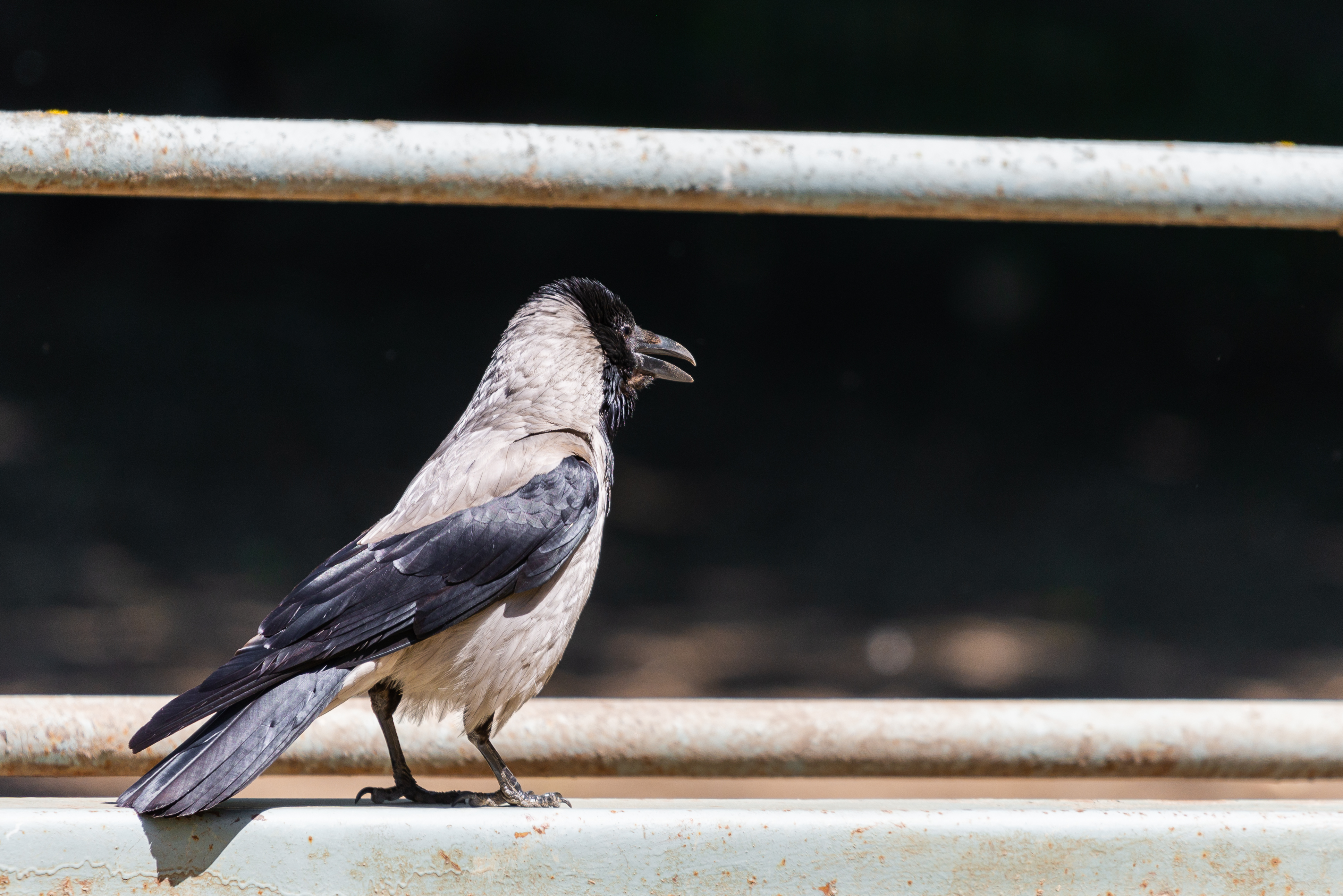 This image captures a close-up of a grey crow (Corvus cornix) comfortably perched on a metal fence. Sunlight filters through foliage, illuminating the bird and casting soft shadows. The crow's feathers display its characteristic grey coloration on its back and chest, contrasting with its black wings and head. The bird's beak is slightly ajar, as if it is about to vocalize or is in mid-communication.