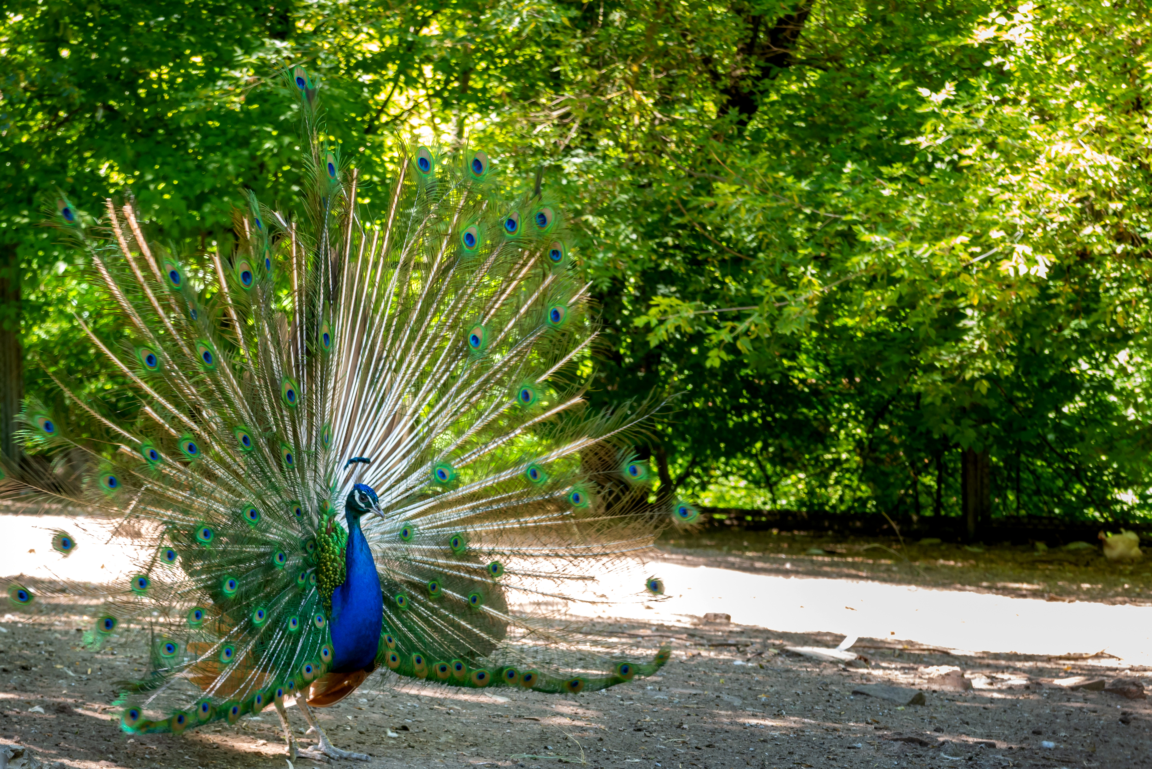 Павлин распускает свой веер в солнечном лесу