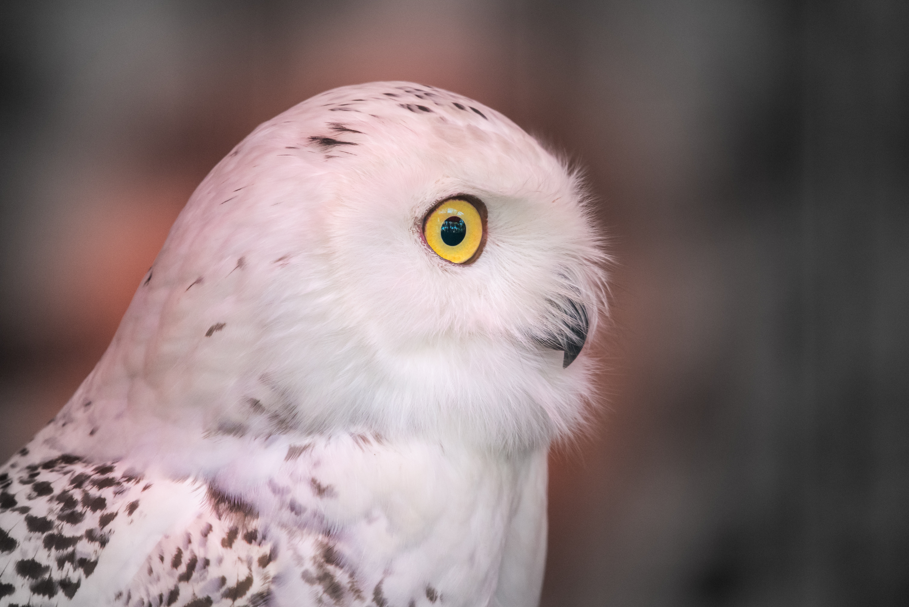 This captivating close-up portrait of a snowy owl captures the exquisite beauty and mystique of this majestic bird. The owl's gaze is directed to the side, lending the image a sense of dynamism and intrigue. The primary focus is on its piercing yellow eye, which seems to glow from within, reflecting light and drawing the viewer's attention.