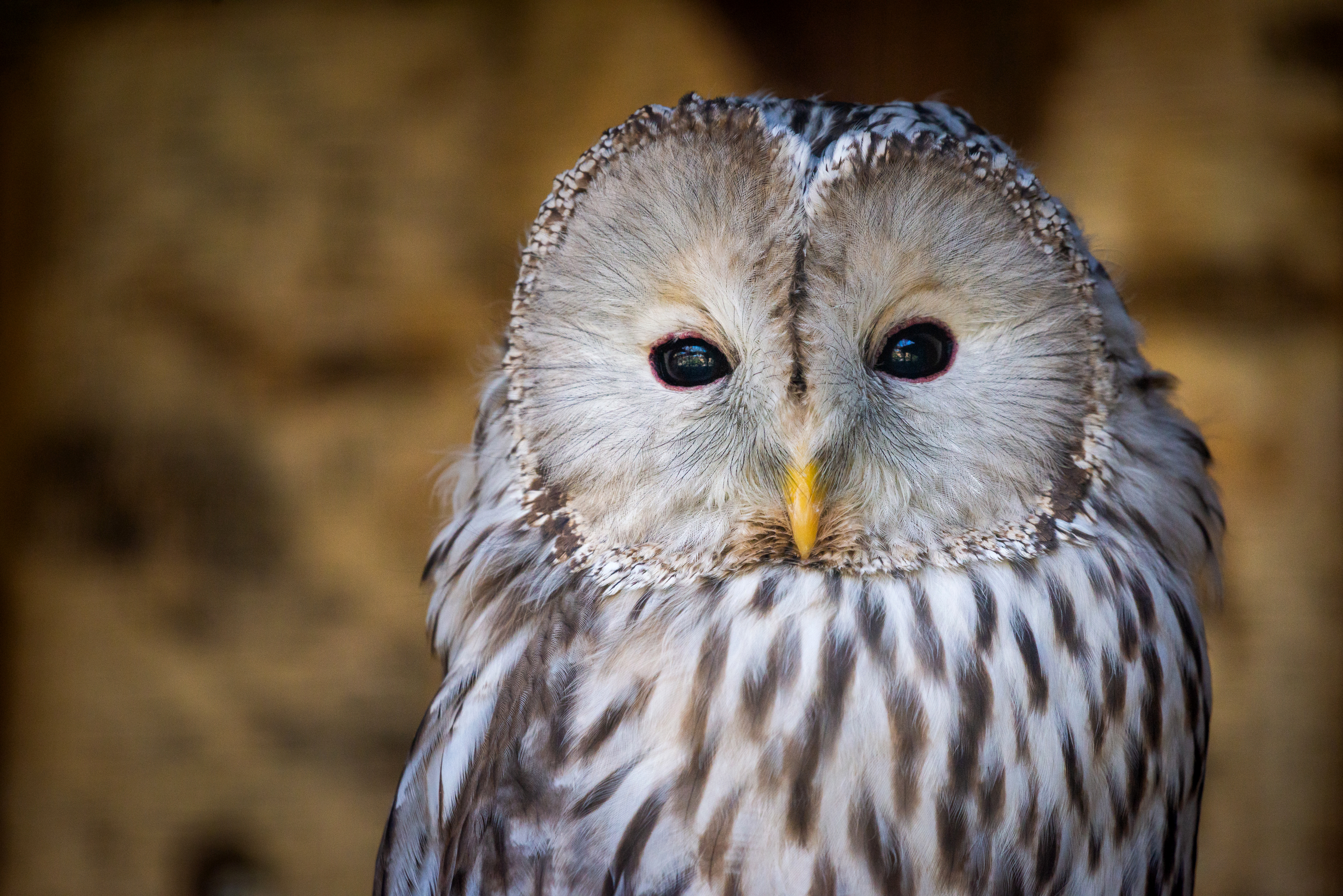 The soft, blurred background, rendered in warm golden-brown tones, creates a perfect contrast with the owl's intricately detailed plumage, focusing all attention on the predator. The light falling on the bird's head gently illuminates its features, emphasizing its expressive eyes and sharp yellow beak.