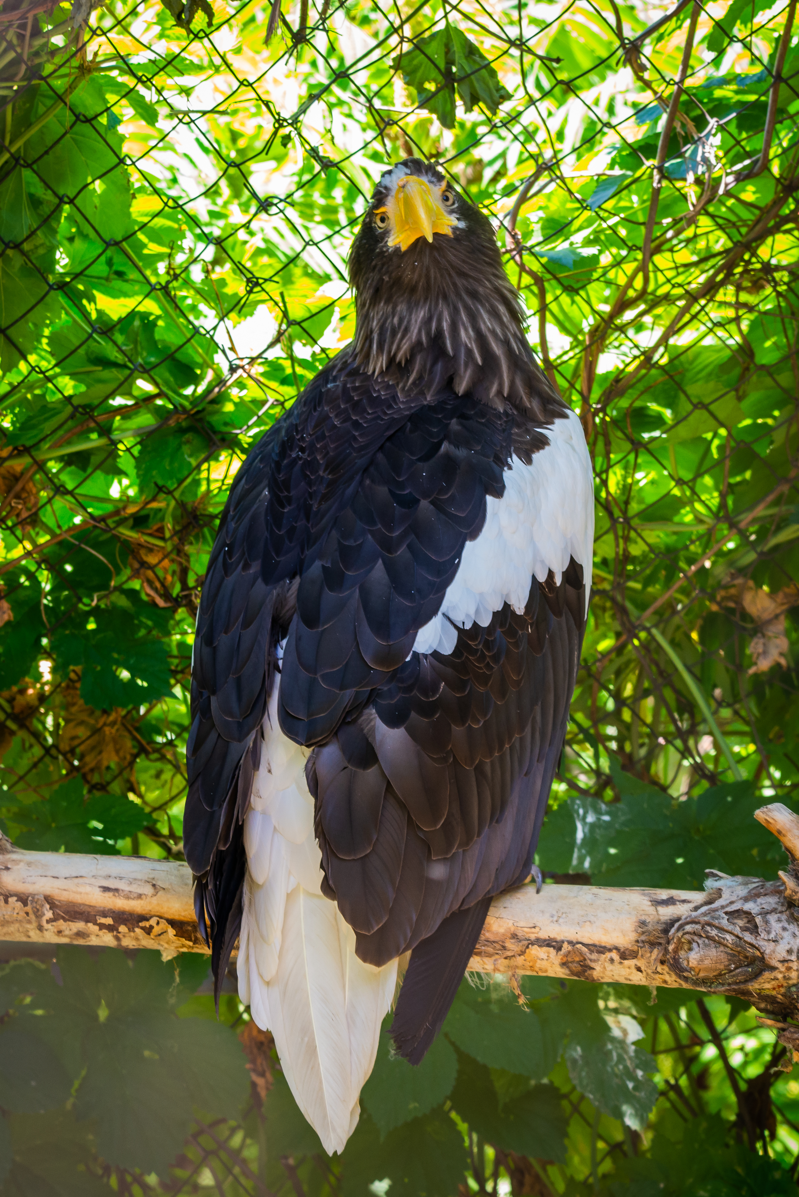 На фотографии изображен великолепный орлан-белохвост (Haliaeetus pelagicus), один из самых крупных хищных птиц в мире, сидящий на толстой деревянной ветке. Композиция запечатлела птицу сзади, демонстрируя ее мощное оперение и внушительные размеры. Фон состоит из густой зелени листвы и сетки ограды зоопарка, что создает ощущение естественной среды обитания, но при этом подчеркивает, что это животное находится под наблюдением человека.